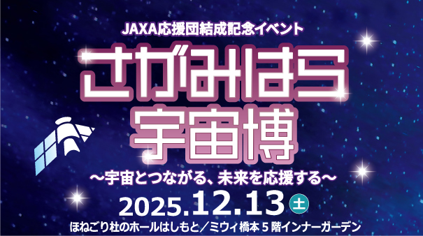 相模原市が「JAXA応援団」の結成記念として開催する「宇宙を身近に感じられるまち さがみはら」を体感できるイベントです。本村賢太郎相模原市長とJAXA宇宙科学研究所の藤本正樹所長が登壇するJAXA応援宣言のほか、津田雄一副所長と宇宙タレント黒田有彩氏によるトークショー、宇宙飛行士・古川聡特別講演会「夢をかなえる力~ミッションを通して感じた宇宙の魅力~」を開催します。体験エリアでは、移動式プラネタリウムや宇宙飛行士訓練服での記念撮影など、子どもから大人まで楽しめる多様なコンテンツを実施します。