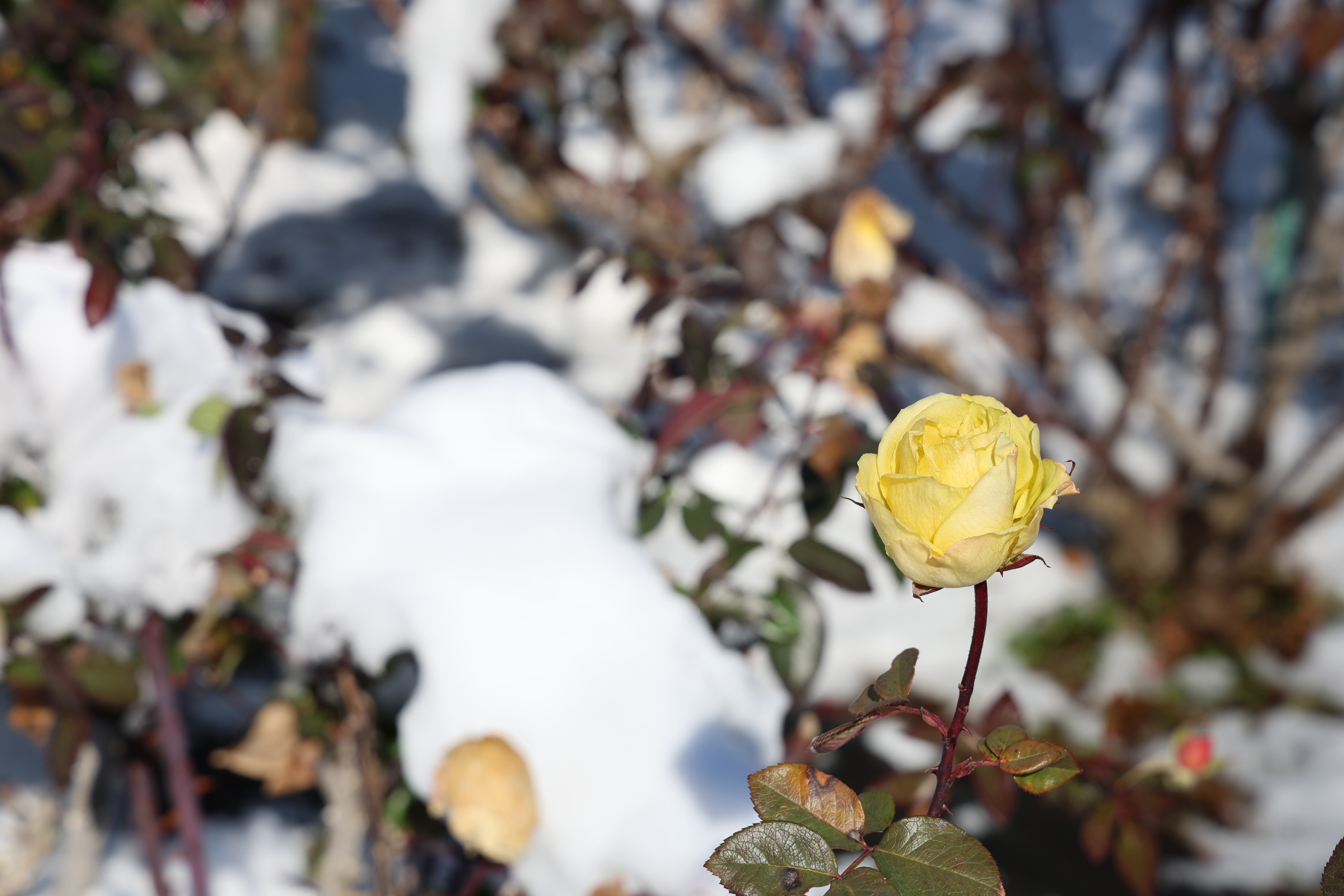 このあたりでは珍しい雪で、バラ園はしんと白くなりました。